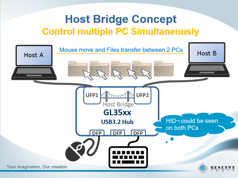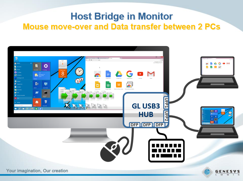 You can seamlessly transfer data between two PCs using a mouse via a USB HUB.