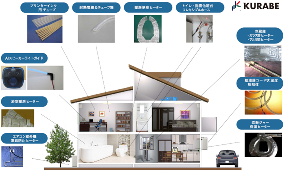 株式会社クラベは、厳しい環境下でも電気機器を安全に使用するために欠かせない耐線。 車載用など信頼性を重視する用途で安全にかつ最適に機能する発熱体。独自に進化をした 材料技術を応用した絶縁材料や成型品・チューブなどの高分子高機能素材を提供。自動車、 住宅設備、情報通信、家電、産業機器、医療などの幅広い分野で採用されています。